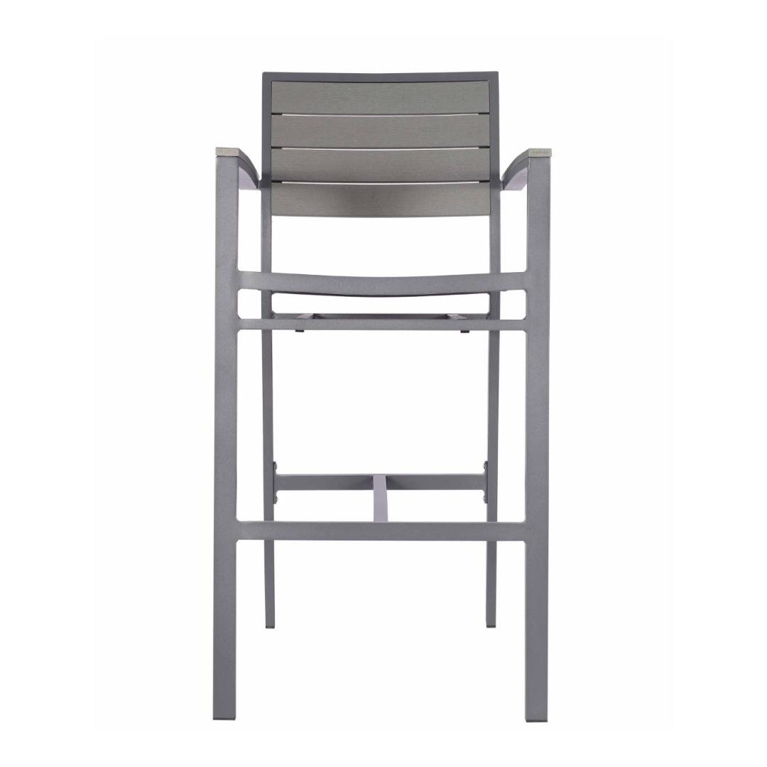 The Villa High Stool features a horizontal slat-back design with a durable EPC aluminium frame, making it an excellent choice for outdoor dining environments.